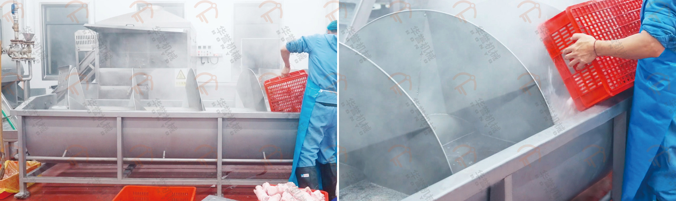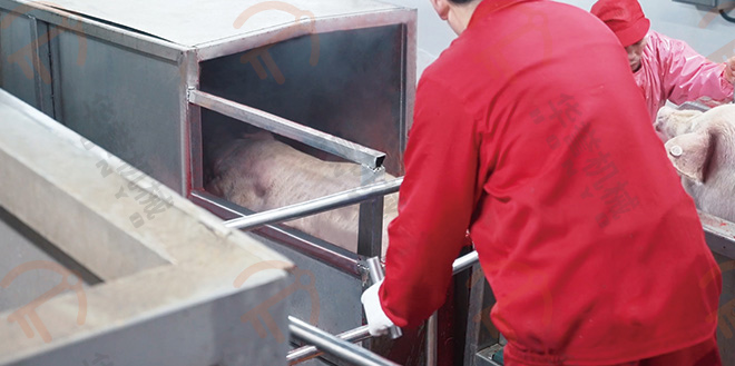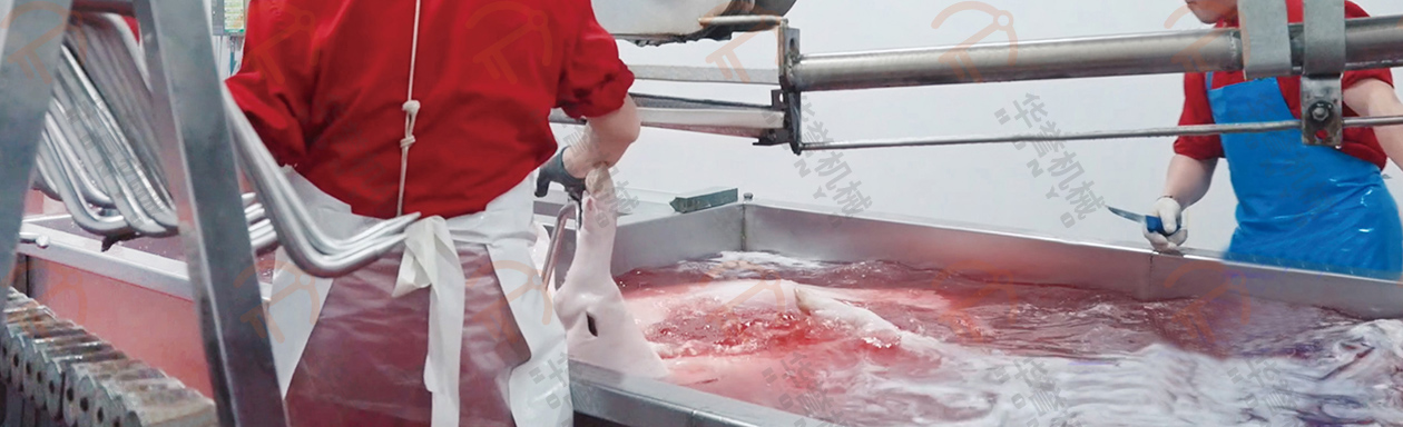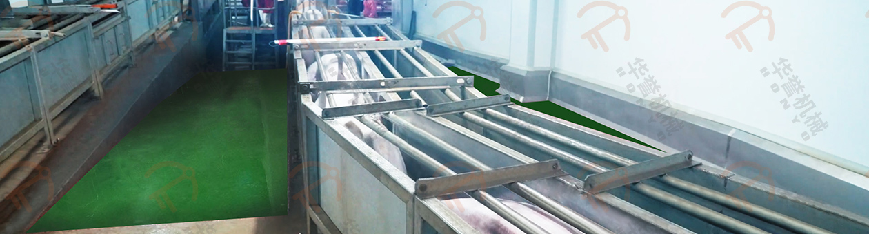 瀝血后的毛豬通過(guò)瀝血輸送線運(yùn)送到運(yùn)河式燙毛池前,通過(guò)下降機(jī)將毛豬浸在池內(nèi)進(jìn)行燙毛。運(yùn)河式燙毛池可實(shí)現(xiàn)人工或PLC遠(yuǎn)程控制操作,實(shí)現(xiàn)精準(zhǔn)控溫,更具有使用成本低、燙毛均勻、循環(huán)水方向與豬體輸送方向相反等優(yōu)勢(shì)。