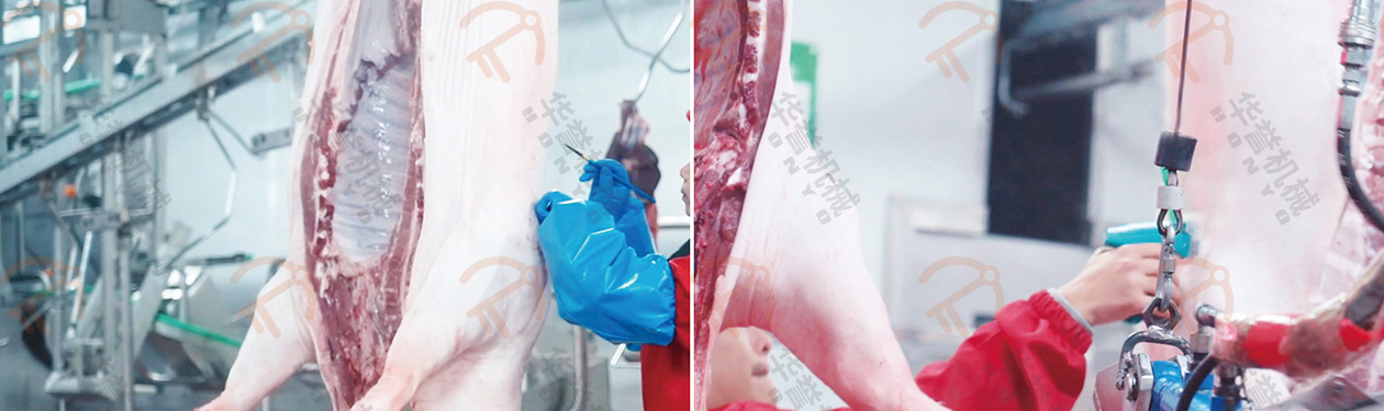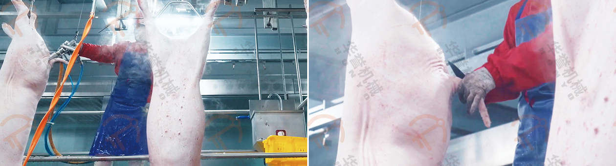 沖洗后的豬胴體由人工進(jìn)行表面燎毛、修刮處理,進(jìn)一步的去除豬胴體表面的細(xì)毛,確保最終產(chǎn)品的清潔度和美觀度。通過(guò)高溫處理,可以有效殺死表面的細(xì)菌,提高衛(wèi)生標(biāo)準(zhǔn)。