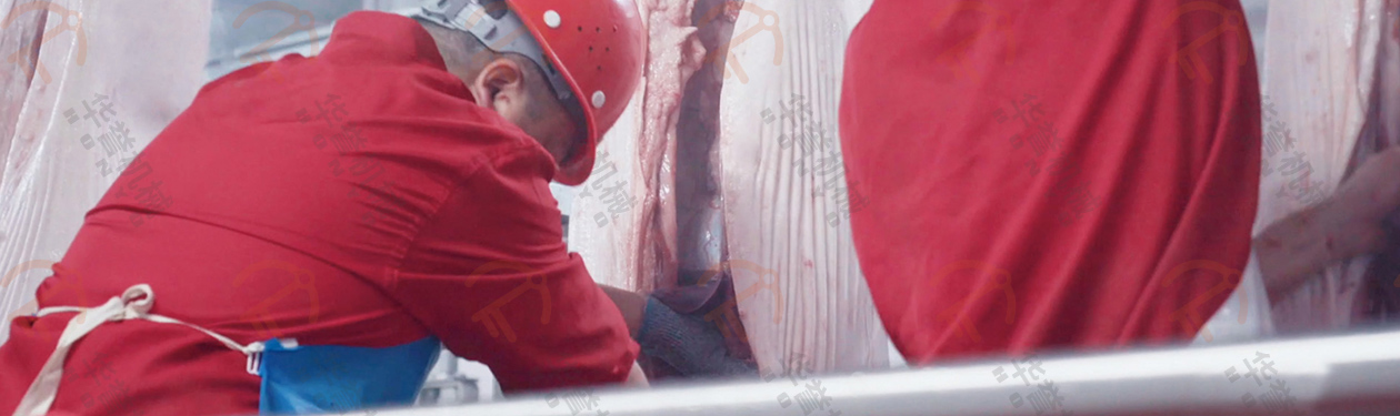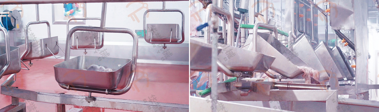 取下后的白臟放入白臟盤(pán)內(nèi),紅臟掛到紅臟鉤上,經(jīng)衛(wèi)生檢疫沒(méi)問(wèn)題后,通過(guò)輸送線送入紅白臟處理間。(白臟:胃、腸等部分;紅臟:心、肝、肺等紅色內(nèi)臟部分)