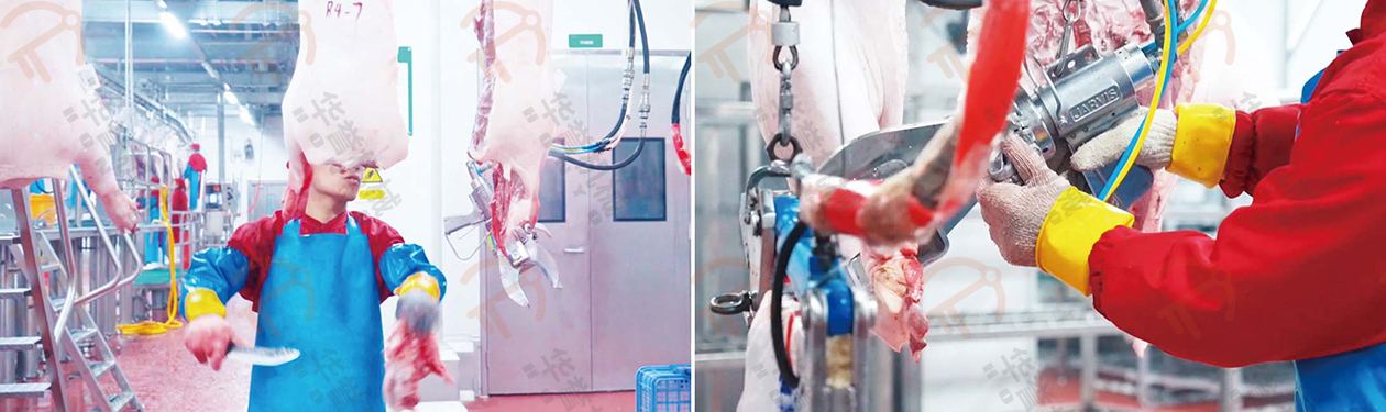 劈半后的豬胴體輸送到人工精修區(qū),在這里進(jìn)行修割胴體和去除前蹄的操作。剪蹄鉗主要用于動(dòng)物的蹄部處理,采用液壓式設(shè)計(jì),操作簡(jiǎn)單,效率更高。