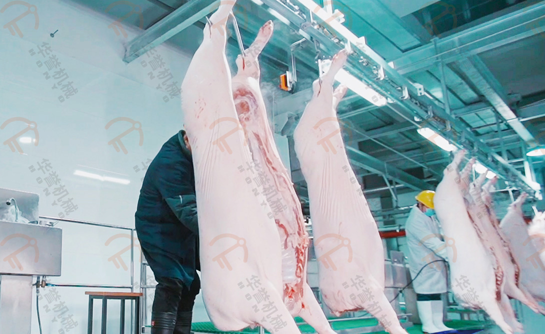 去頭后的豬胴體在輸送線上由工人完成開(kāi)胸操作。