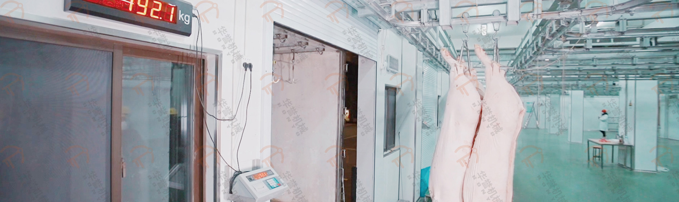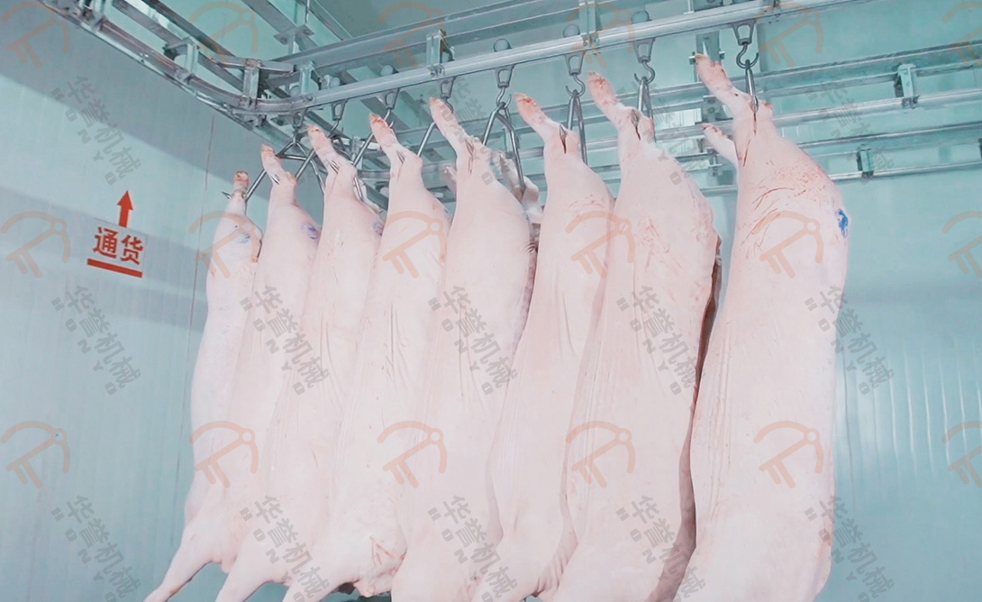 處理好的豬胴體,再次進(jìn)行復(fù)檢蓋章,確保豬肉符合國(guó)家標(biāo)準(zhǔn)。再將豬胴體通過(guò)輸送線運(yùn)至快冷間,快速冷卻屠宰后的豬胴體,以減少干耗、延緩微生物繁殖,并提高肉品質(zhì)量。