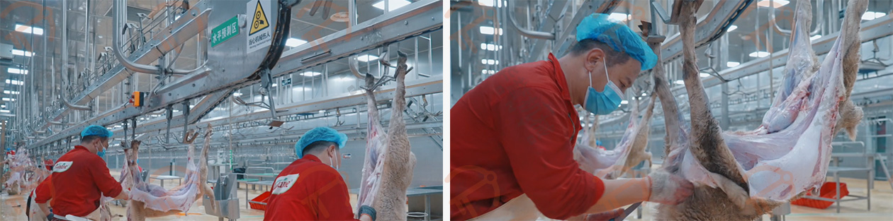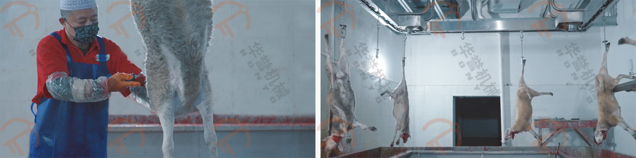 放血/預(yù)剝自動(dòng)輸送線的掛鉤鉤住羊的后腿,扯皮自動(dòng)輸送線的掛鉤鉤住羊的兩前腿,這兩條自動(dòng)線的速度是同步前進(jìn)的,羊的腹部朝上、背部朝下,平衡前進(jìn),在輸送的過程中進(jìn)行預(yù)剝皮,這種預(yù)剝的方式可有效的控制在預(yù)剝過程中羊毛粘在胴體上。